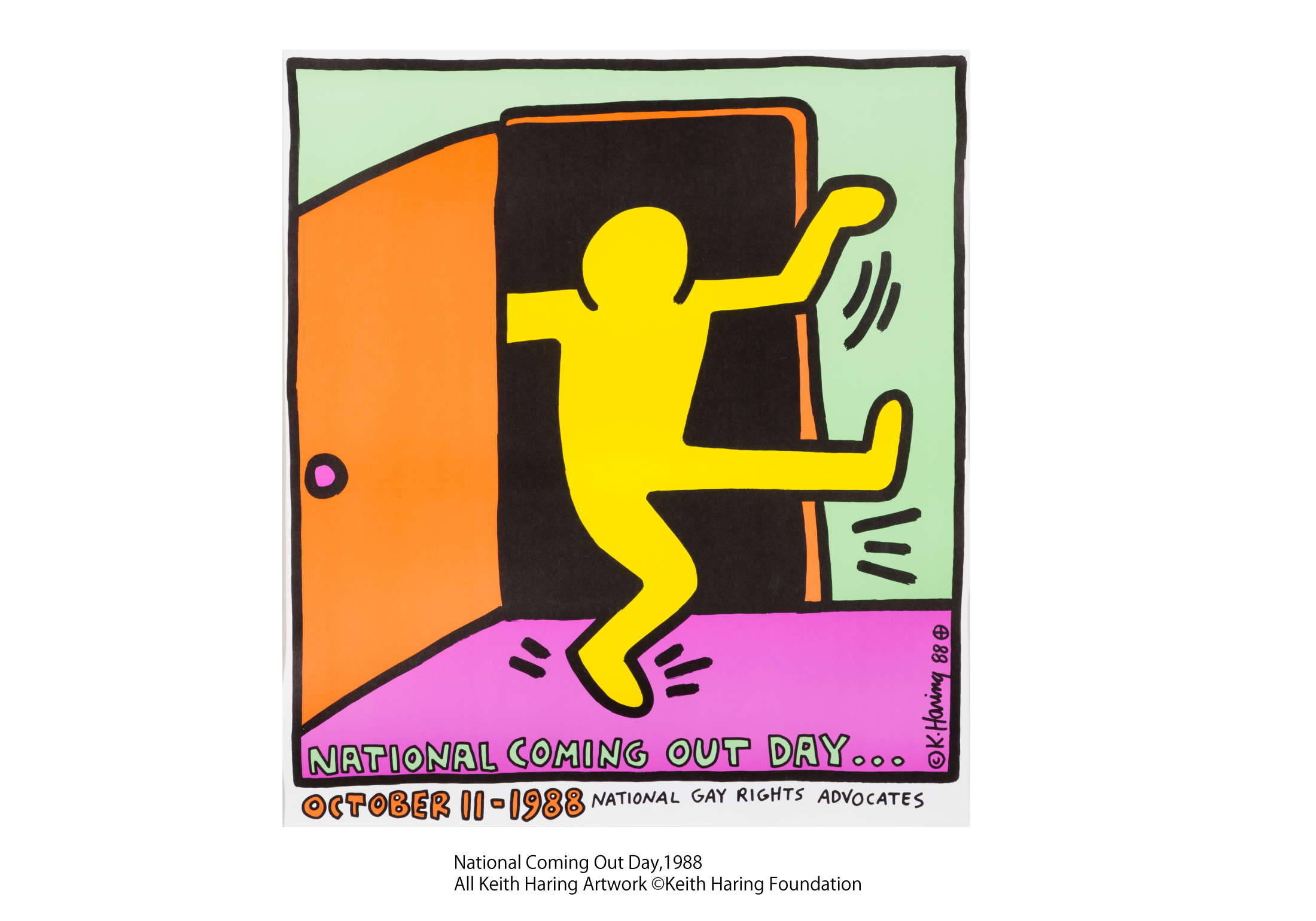 性的指向や性自認を公言する人々を祝福する記念日として1988年に定められた「ナショナル・カミングアウト・デー」。ゲイであることをオープンにして活動したキース・ヘリングは、この記念日のシンボルとなる作品を制作しました。現在でも、この作品はナショナル・カミングアウト・デーのシンボルとして国際的に認知されています。