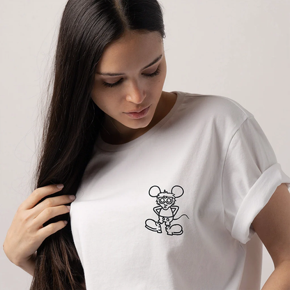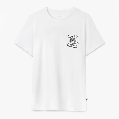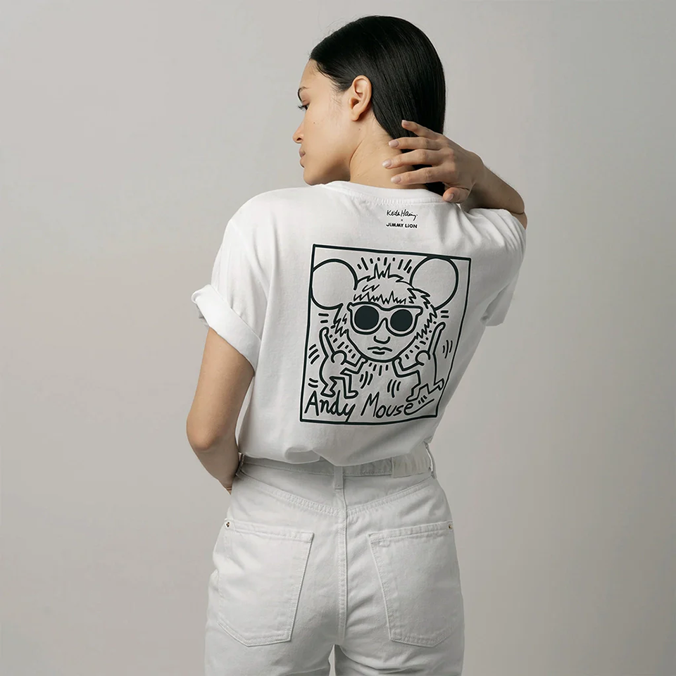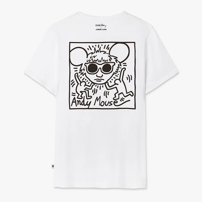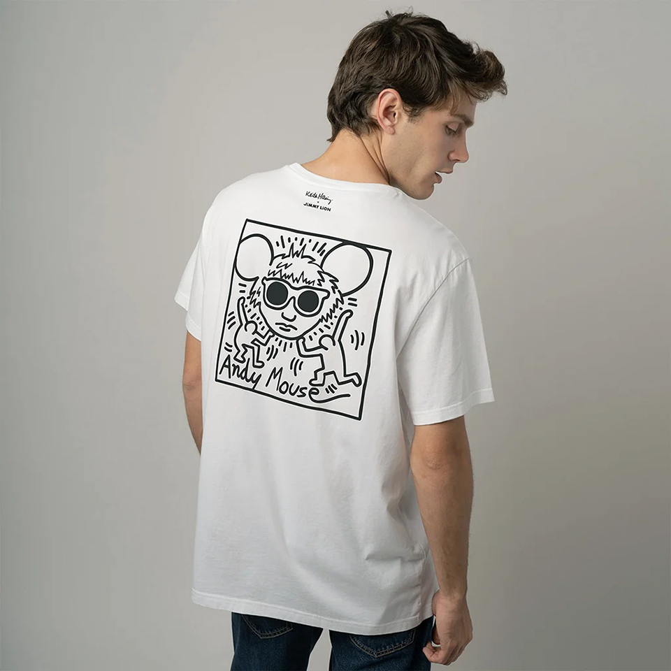 Featuring the legendary Andy Mouse character printed on both the chest and the back, this tee captures the whimsical spirit of Haring’s art.