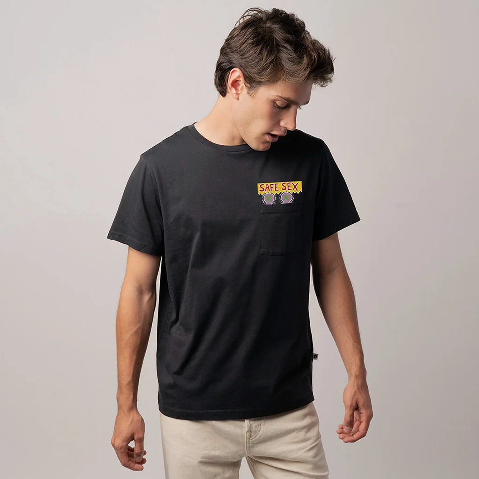 This tee features one of Haring’s iconic characters alongside the powerful “SAFE SEX” message, subtly printed on the chest pocket.