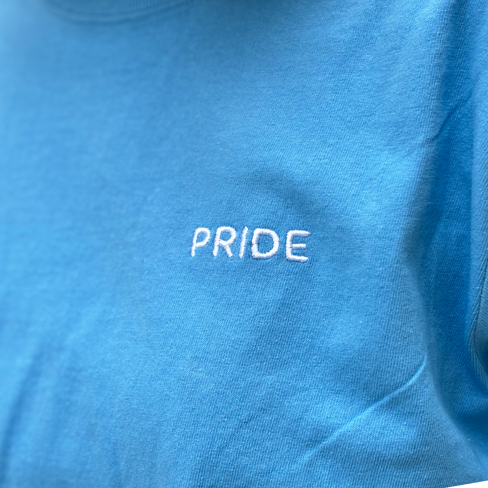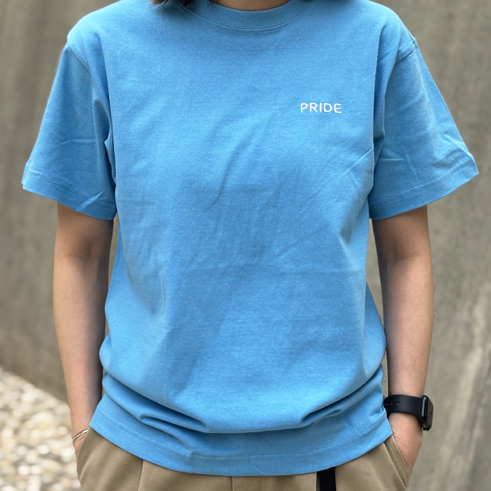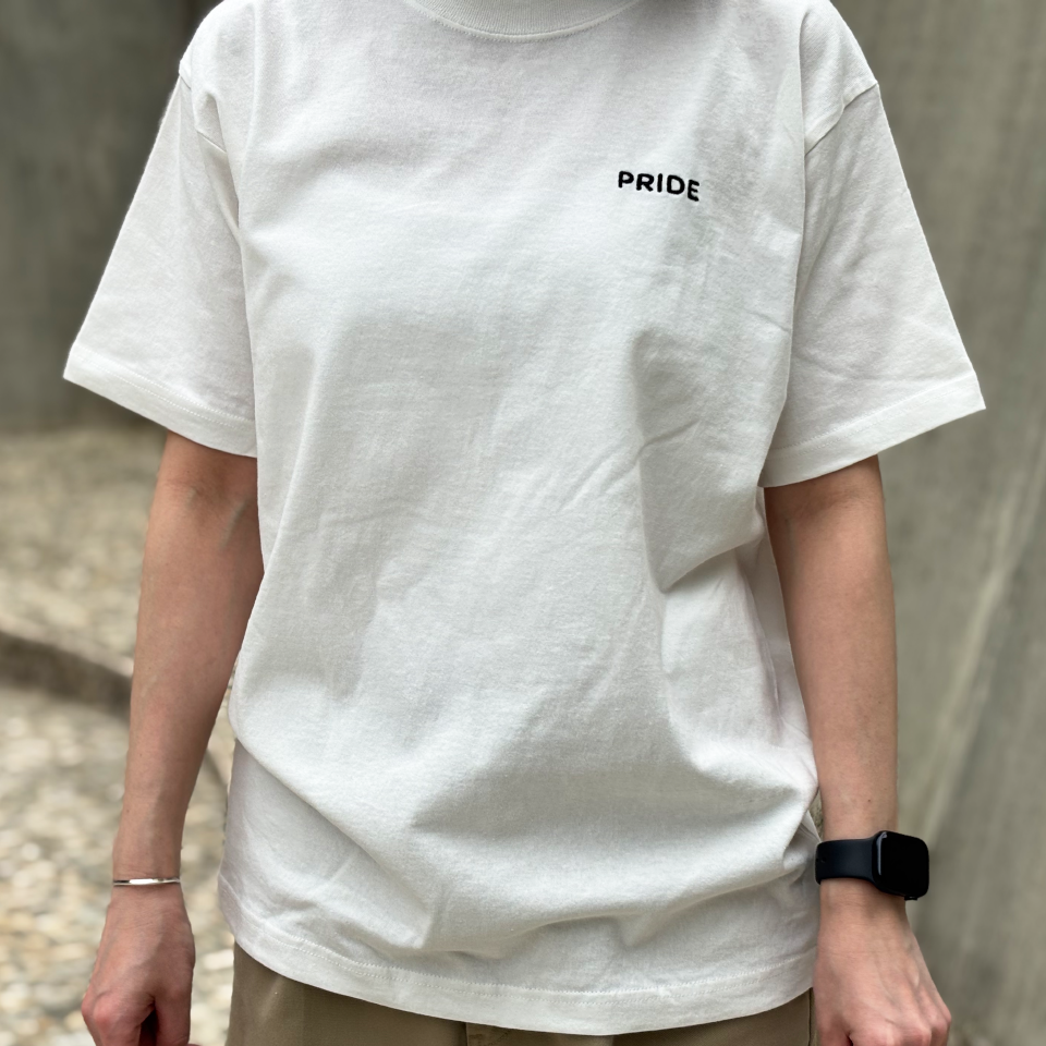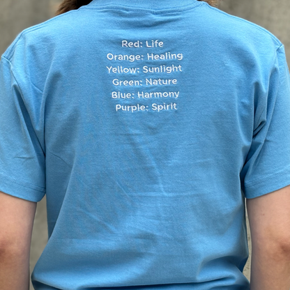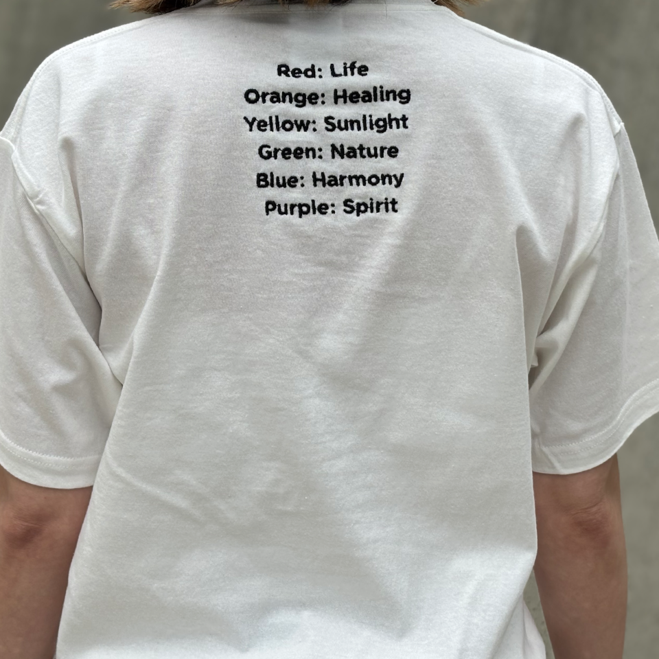 「レインボーフラッグ」の各色に象徴される、LGBTQ+の人々の生命、癒し、太陽、自然、調和、精神といった価値観をバックプリントに施した、中村キース・ヘリング美術館オリジナルのTシャツ。