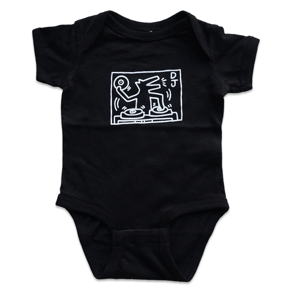 ヘリングのアイコニックな作品 "DJ Dog" をデザインした赤ちゃん用のロンパース。