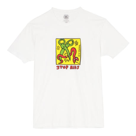 1980年代のエイズ・エピデミックに際して、ヘリングが制作したポスター"Stop AIDS"をデザインした半袖Tシャツ。